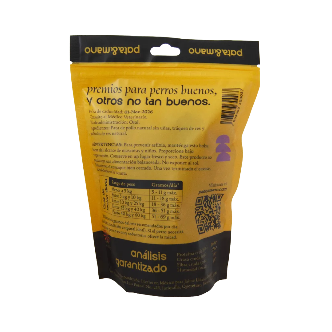 Patas de pollo, pulmón de res y tráquea de res deshidratados. Nada más.