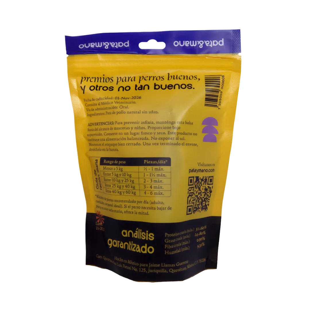 Las patas de pollo contienen glucosamina y condroitina de forma natural, compuestos conocidos por apoyar la salud de las articulaciones, ayudar a mantener la flexibilidad y reducir inflamación en perros, especialmente en razas activas o adultos mayores.